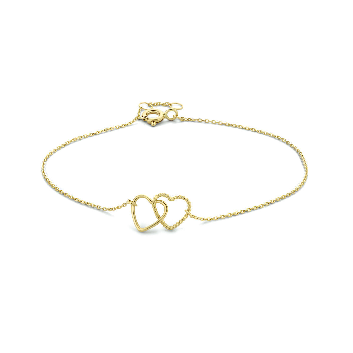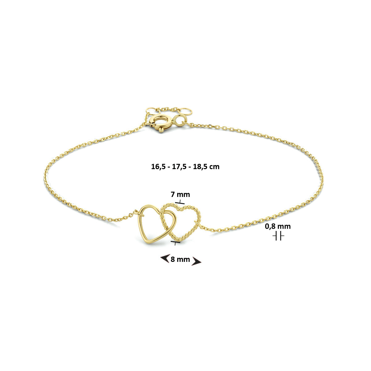 9k Geelkleurige armband uitgevoerd met twee hartjes. De armband heeft draaglengtes van 16.5, 17.5 en 18.5cm. De hartjes hebben een afmeting van 7x8mm. De schakelbreedte is 0.8mm.