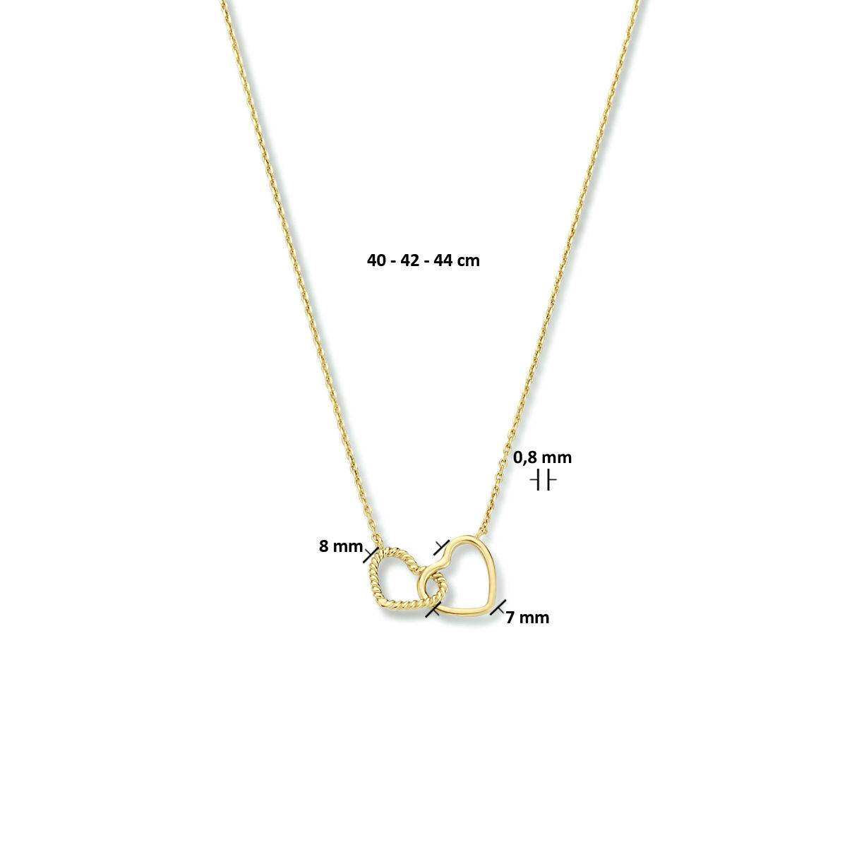 9k Geel kleurige collier uitgevoerd met twee hartjes. Het collier heeft draaglengtes van 40, 42 en 44cm. De hartjes hebben beide een afmeting van 7x8mm. De schakelbreedte is 0.8mm.