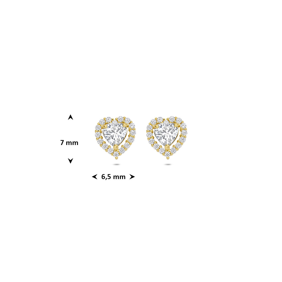 9k Geelkleurige oorknoppen met een hart en zirkonia. De oorknoppen hebben een afmeting van 7x6.5mm.