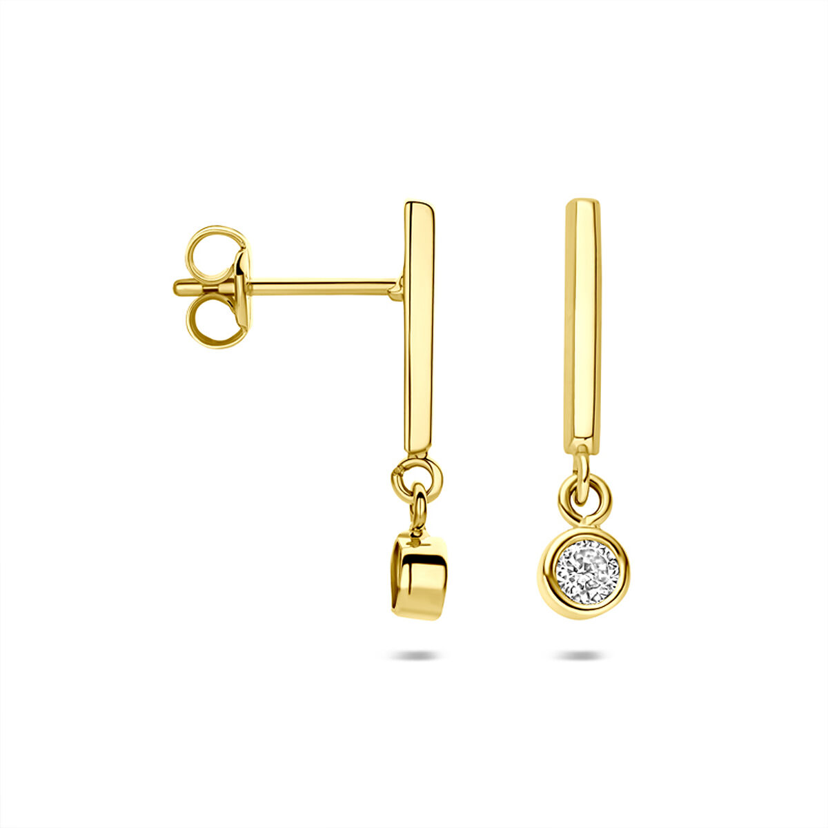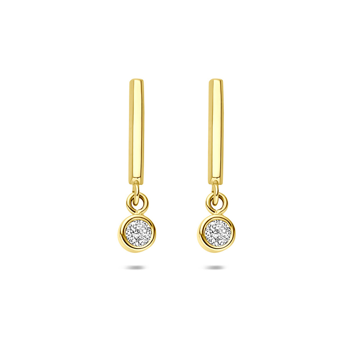 14k Geelgouden oorhangers uitgevoerd met zirkonia. De oorhangers hebben een afmeting van 17.5x3.5mm.